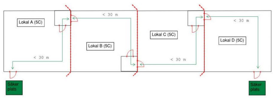 Lokal A har direkt tillgång till sin ena utrymningsväg. Den andra nås genom passage via lokal B, C och D (samtliga måste passeras).